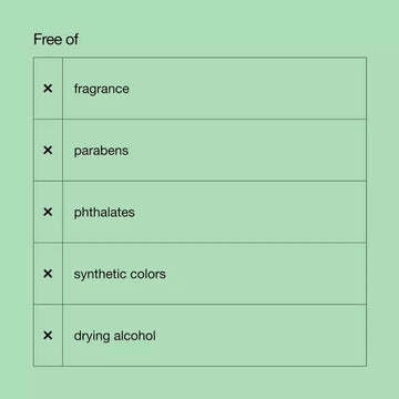 Paraben-free, Phthalate-free, Oil-free, Free of denatured alcohol, Free of synthetic colors, SLS-free, SLES-free, Sulfate-free, Gluten-free